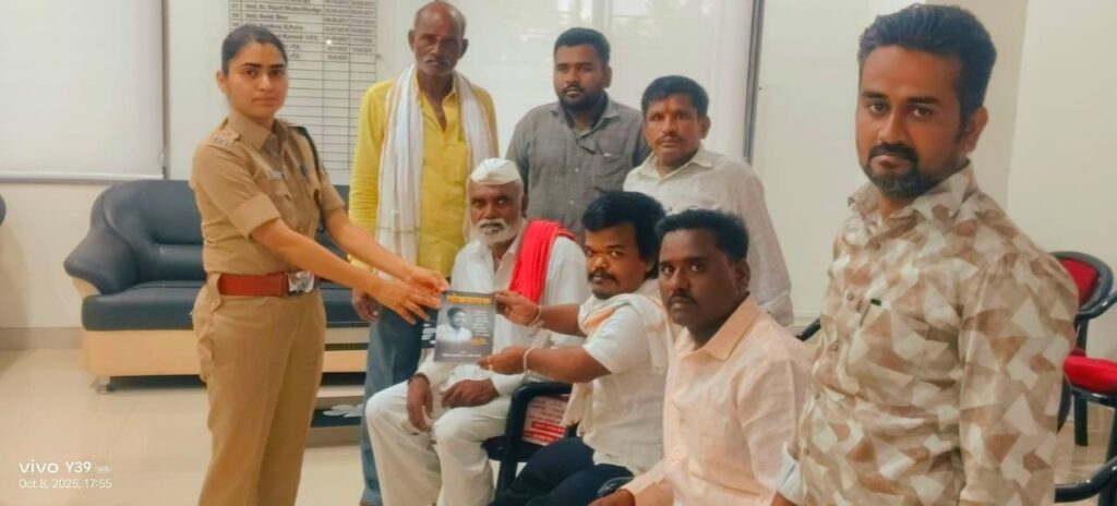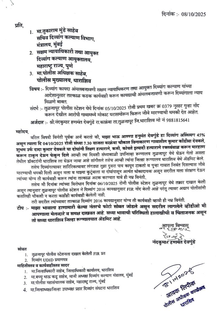 तुळजापूर (दि. ८ ऑक्टोबर २०२५)तुळजापूर तालुक्यातील काकरंबा (देवगुंडे) येथील ४५% दिव्यांग असलेल्या श्री. हनुमंत देवगुंडे या दिव्यांग नागरिकावर गावातील काही समाजकंटकांनी निर्दयी मारहाण करून “जिवे मारण्याची धमकी” दिल्याची धक्कादायक घटना समोर आली आहे. या प्रकाराने परिसरात संतापाची लाट उसळली असून, प्रहार दिव्यांग संघटनेने पोलिस अधीक्षक कार्यालयात धडक देत न्यायाची मागणी करणारे निवेदन सादर केले.या प्रसंगी संघटनेचे जिल्हाध्यक्ष श्री. मयुर काकडे, उपाध्यक्ष बाळासाहेब कांबळे, जिल्हासचिव महादेव चोपदार, उपाध्यक्ष महेश माळी, शहराध्यक्ष जमीर शेख, पदाधिकारी रवी शित्रे तसेच इतर कार्यकर्ते मोठ्या संख्येने उपस्थित होते.संघटनेने निवेदनात म्हटले आहे की,> “दिव्यांग व्यक्तींवर सतत होत असलेल्या अन्याय, मारहाण आणि धमक्यांना आळा बसला पाहिजे. हनुमंत देवगुंडे यांच्यावर झालेला हा प्रकार हा केवळ वैयक्तिक नसून, संपूर्ण दिव्यांग समाजाच्या सन्मानावर घाला आहे. दोषींवर कठोर कारवाई न झाल्यास संघटना तीव्र आंदोलनाचा इशारा देते.”या घटनेचा व्हिडिओ पुरावा संघटनेकडे असून, पोलिसांकडे गुन्हा दाखल झाल्यानंतरही कारवाई न झाल्याबद्दल संघटनेने पोलिस प्रशासनाविरोधात तीव्र नाराजी व्यक्त केली.पोलिस अधीक्षकांनी निवेदन स्वीकृत करत चौकशी सुरू करण्याचे आश्वासन दिले असले तरी, प्रहार दिव्यांग संघटनेने इशारा दिला आहे की,> “दोषींवर त्वरीत गुन्हा दाखल न झाल्यास जिल्हा स्तरावर तीव्र आंदोलन उभारले जाईल.”